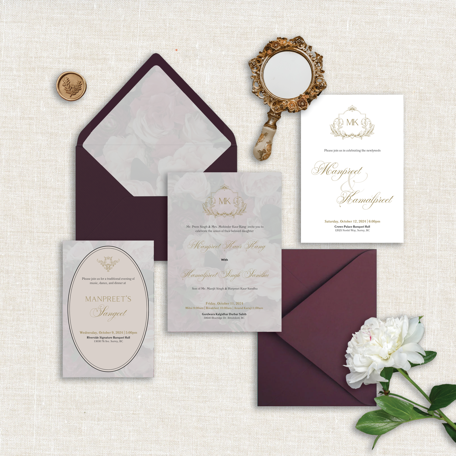 Celebrate your love with the Dark Romance Invitation Set, a striking blend of moody elegance and refined luxury. Deep burgundy tones are layered with soft floral detailing and subtle gilded accents, creating a look that feels both dramatic and timeless. Elegant gold typography and a refined crest motif add a sense of grandeur, while the overall design strikes a balance between romance and sophistication. Perfect for couples drawn to a bold, atmospheric celebration with an unmistakably elevated sense of style.