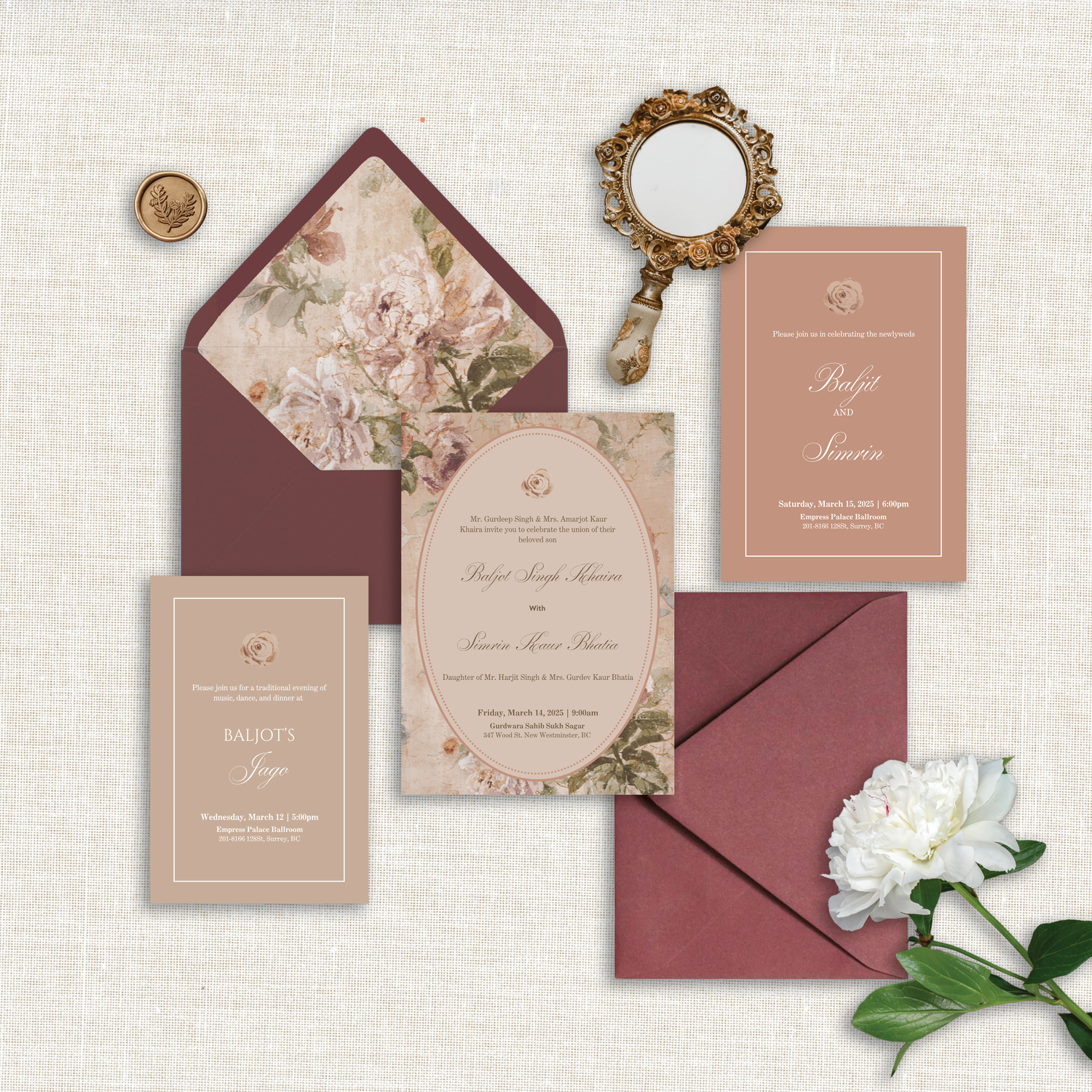 Celebrate your love with the Gilded Peony Invitation Suite, a graceful blend of romantic charm and timeless sophistication. Soft blush and warm taupe tones are layered with painterly floral textures, creating a look that feels delicate yet refined. Elegant script typography and subtle ornamental details evoke a sense of classic luxury, while the rich, muted palette adds warmth and depth. Perfect for couples drawn to a soft, romantic aesthetic, this suite captures the beauty of florals with an elevated, heirloom-inspired touch.